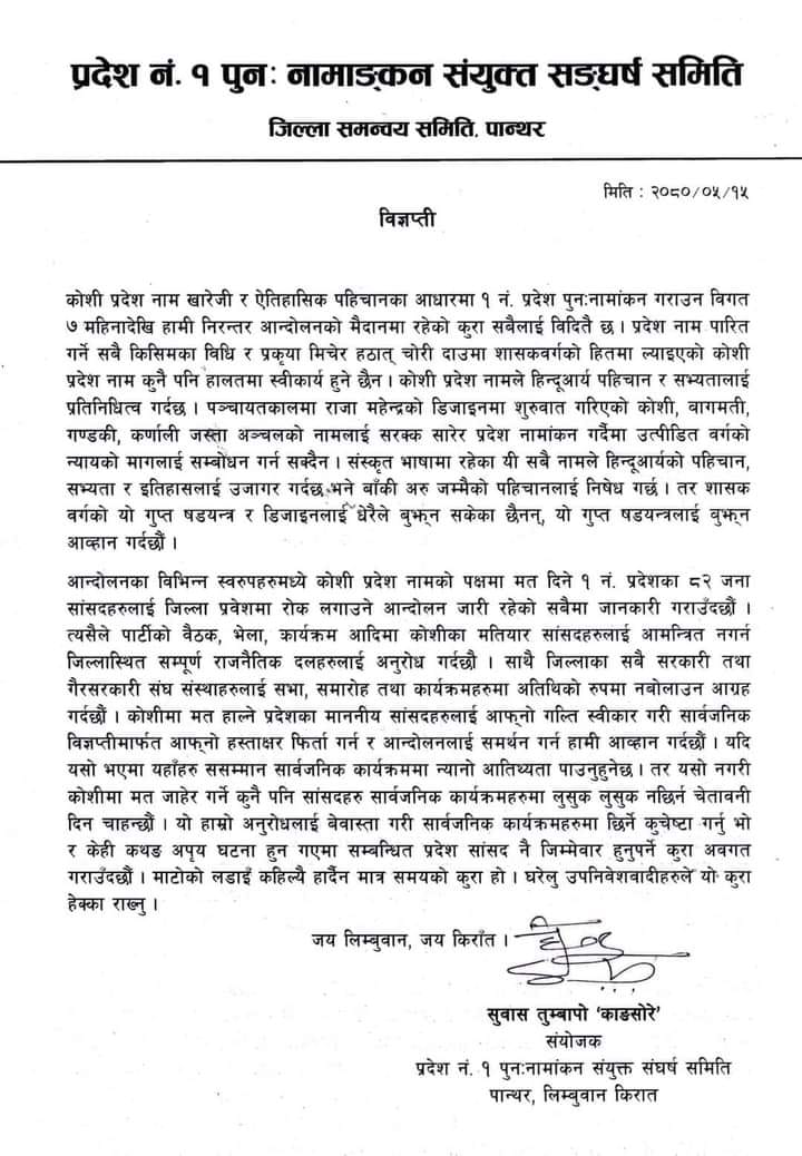 प्रदेशको नाम ऐतिहासिक पृष्ठभूमी, शासकीय भूगोल र सभ्यताको आधारमा ‘लिम्बुवान किरात’ राखिनुपर्ने माग सहित आन्दोलित बनेको संघर्ष समितिले आफ्नो आग्रहलाई बेवास्ता गरी सार्वजनिक कार्यक्रमका लागि जिल्ला प्रवेश गरे त्यसबाट निम्तिन सक्ने अप्रिय घटनाको स्वयंम् प्रदेशसभा सदस्यले लिनुपर्ने चेतावनी दिइएको छ ।