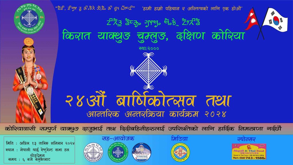 १२ अप्रिल २०२४, दक्षिण कोरिया। किरात याक्थुङ चुम्लुङ, दक्षिण कोरिया केन्द्रले आफ्नो २४ औं बार्षिकोत्सव मनाउदैछ। अप्रिल १३ को दिन २४ औं बार्षिकोत्सव मनाउन लागिएको हो।