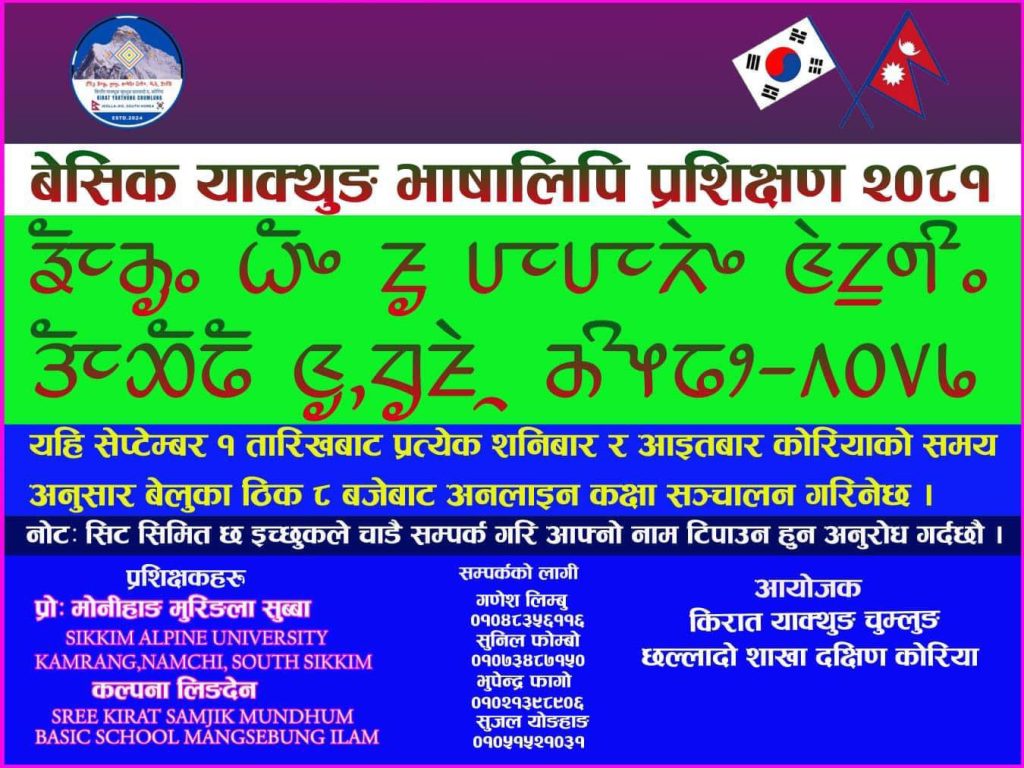 १२ भदौ २०८१, दक्षिण कोरिया। किरात याक्थुङ चुम्लुङ, दक्षिण कोरिया, छल्लादो शाखाले आधारभूत याक्थुङ (लिम्बू) भाषा तथा लिपि प्रशिक्षण कार्यक्रम आयोजना गर्ने भएको छ।