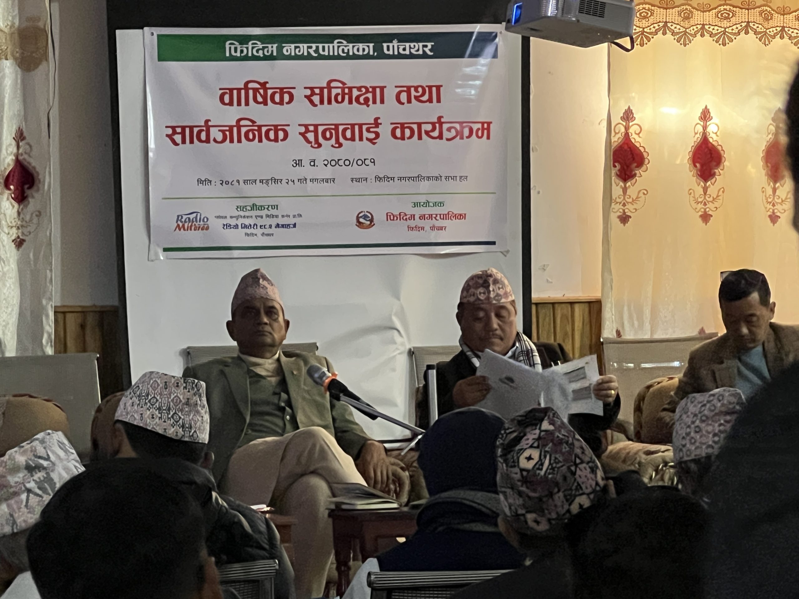 मंगलबार फिदिम नगरपालिकाको सभाहलमा एक कार्यक्रमको आयोजना गरि सार्वजनिक सुनुवाई कार्यक्रम सम्पन्न गरिएको हो । कार्यक्रममा आर्थिक वर्ष २०८०/०८१ को वार्षिक प्रगति समिक्षा र आर्थिक वर्ष २०८१/०८२ को प्रथम चौमासिक प्रगतिको समिक्षा गरिएको थियो ।