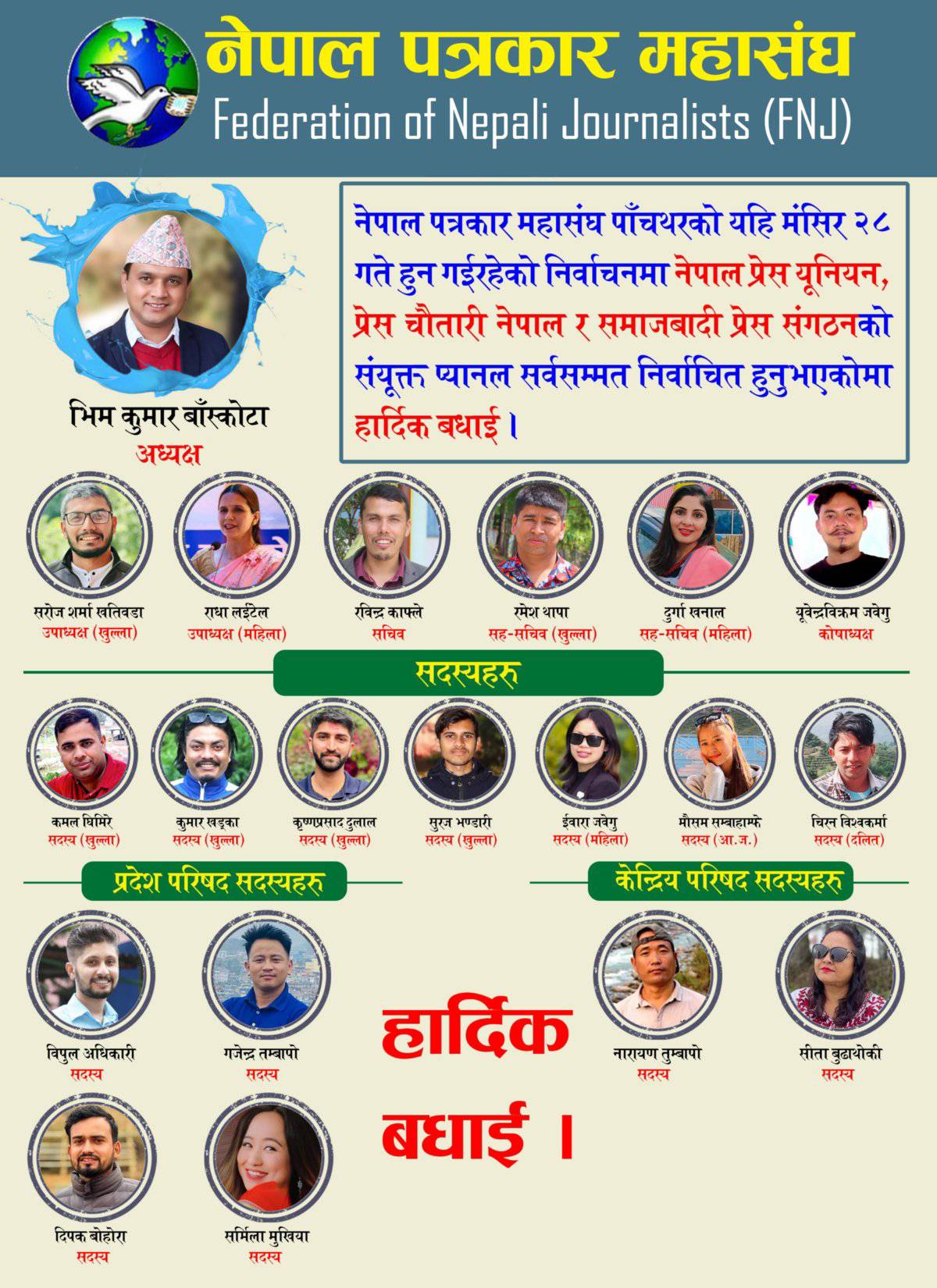 २७ मंसिर २०८१, पाँचथर। नेपाल पत्रकार महासंघ पाँचथर शाखामा सर्वसम्मत नेतृत्व चयन भएको छ।