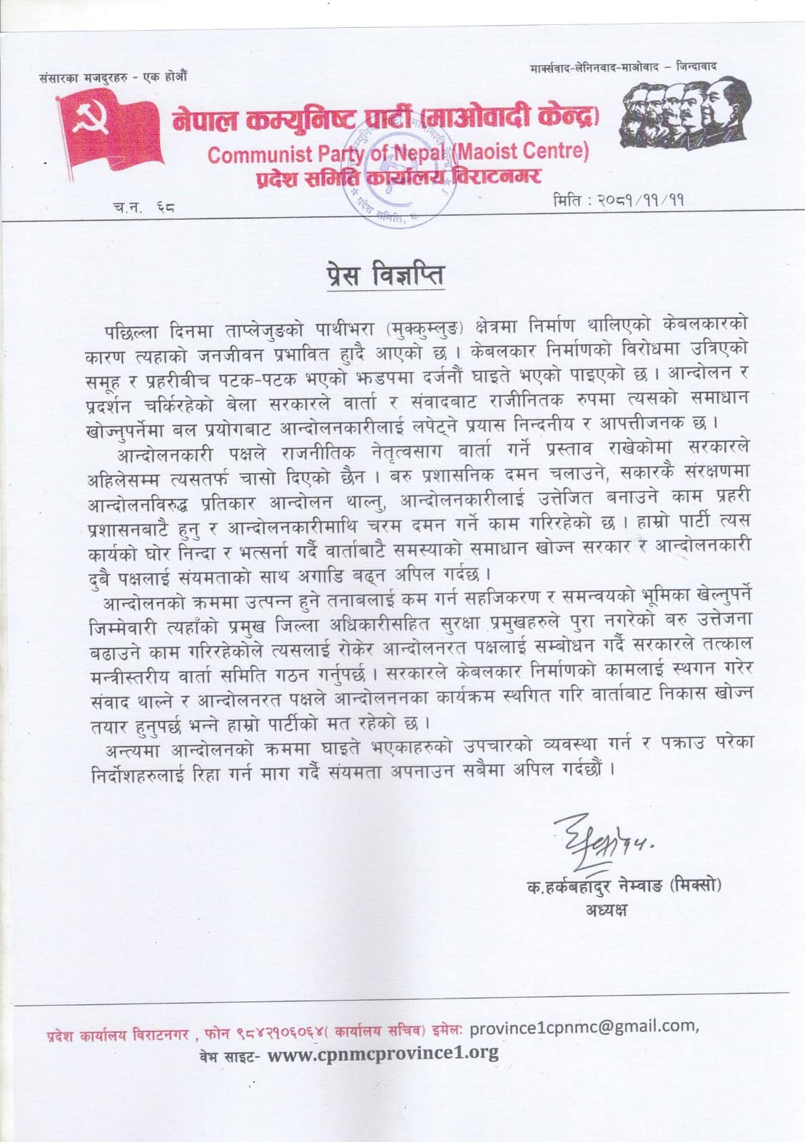 माओेवादी केन्द्रका प्रदेश अध्यक्ष हर्क बहादुर नेम्बाङ (मिक्सो)ले आईतबार विज्ञप्ती जारी गर्दै यस्तो माग गरेका हुन्। केबलकार निर्माणको विरोधमा उत्रिएको समूह र प्रहरीबीच पटक–पटक भएको झडपमा दर्जनौं घाइते भएको बताउँदै सरकारले वार्ता र संवादबाट राजीनितक रुपमा त्यसको समाधान खोज्नुपर्नेमा बल प्रयोगबाट आन्दोलनकारीलाई लपेट्ने प्रयास निन्दनीय र आपत्तीजनक रहेको विज्ञप्तिमा उल्लेख छ।