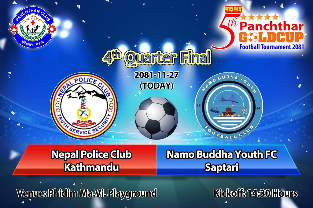 फिदिम माविको खेलमैदानमा हुने प्रतियोगिताको अन्तिम क्वाटरफाइनलमा विभागीय टोली नेपाल पुलिस क्लवले नमो बुद्ध एफसी सप्तरीको सामना गर्दैछ। खेल दिउँसो २ः१५ देखि सुरु हुने आयोजकले जनाएको छ।
