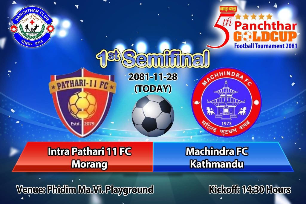 प्रतियोगिताको पहिलो सेमीफाइनलमा आज मच्छिन्द्र फुटवल क्लव काठमाडौं र इन्ट्रा पथरी ११ फुटवल क्लव बिच प्रतिश्पर्धा हुँदैछ। पहिलो सेमीफाइनल खेल दिउँसो २ः३० बजेदेखि फिदिम माविको खेलमैदानमा सुरु हुनेछ।