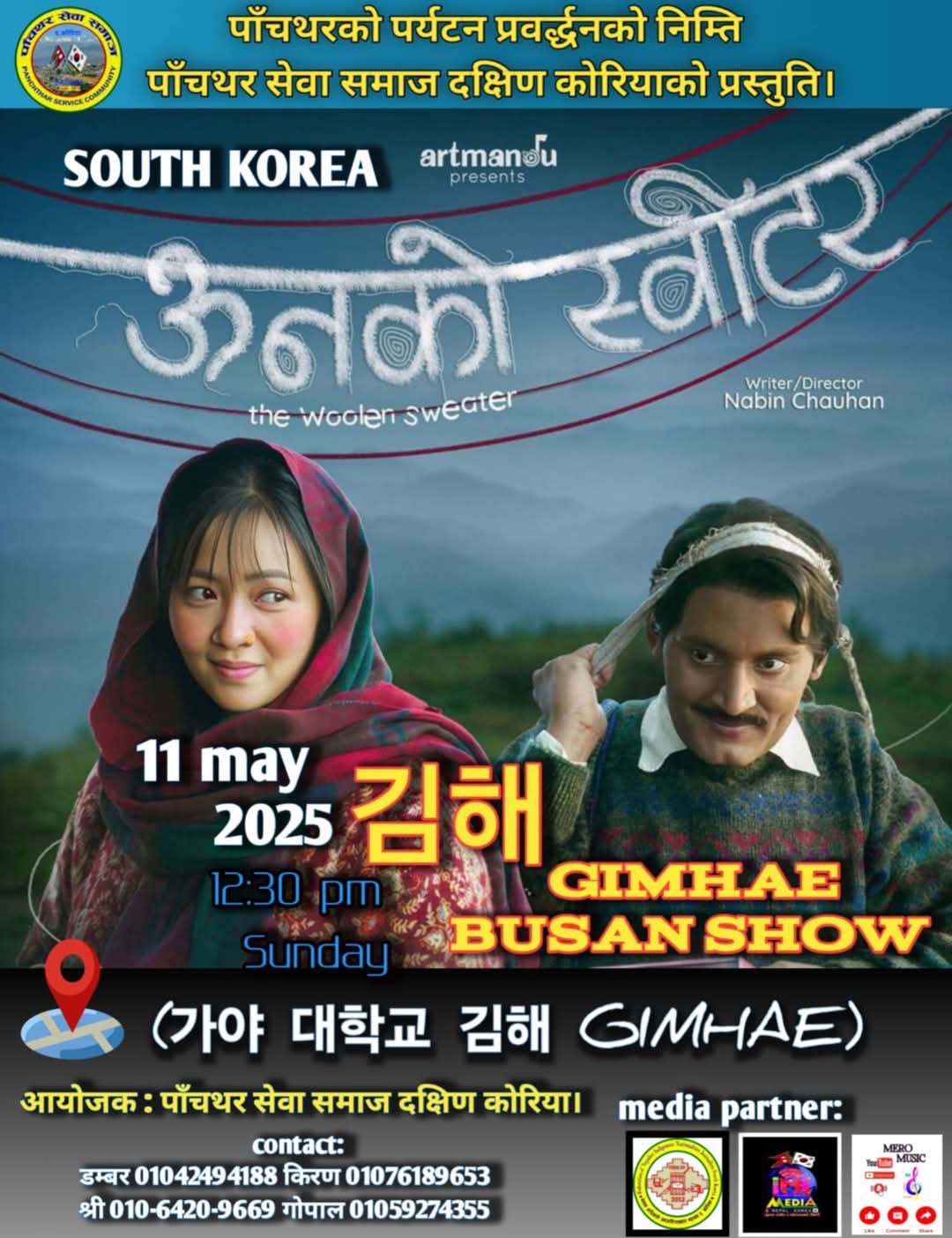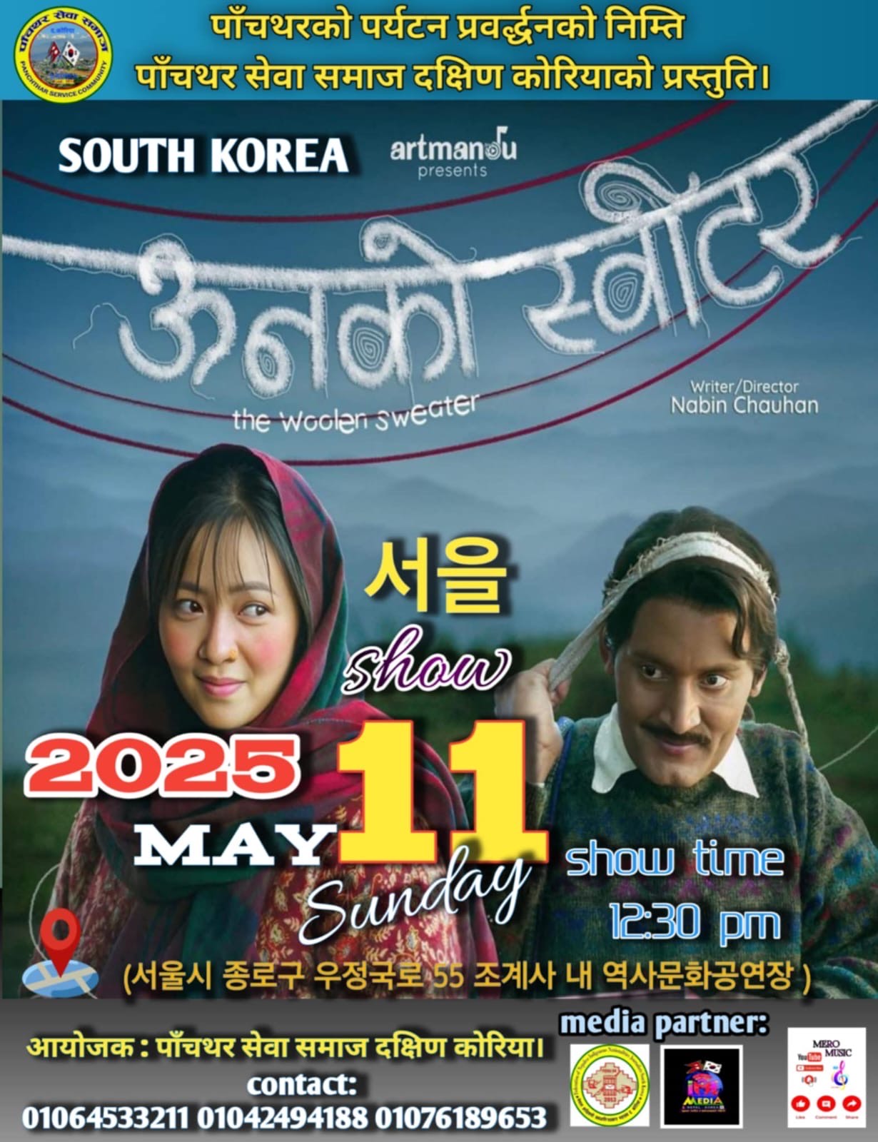 पाँचथरको विभिन्न रमणीय पर्यटकिय स्थानमा छायाङ्कन गरिएको चलचित्र “ऊनको स्वीटर” पर्यटन प्रवर्द्धनको निम्ति २०२५ मे ११ आइतबार सौल र खिम्मे बुसानमा एकसाथ प्रदर्शन हुदै कोरियाको विभिन्न शहरमा पाँचथर सेवा समाज दक्षिण कोरियाले लिएर आउदै छ ।