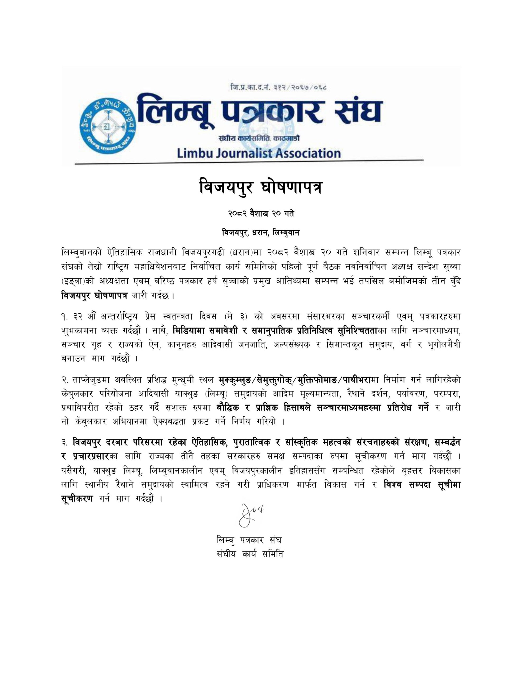 २० वैशाख २०८२, धरान। तीन बुँदे विजयपुर घोषणापत्र जारी गर्दै लिम्बू पत्रकार संघको पूर्ण बैठक शनिबार ऐतिहासिकस्थल विजयपुरगढी सुनसरी, धरानमा सम्पन्न भएको छ।
