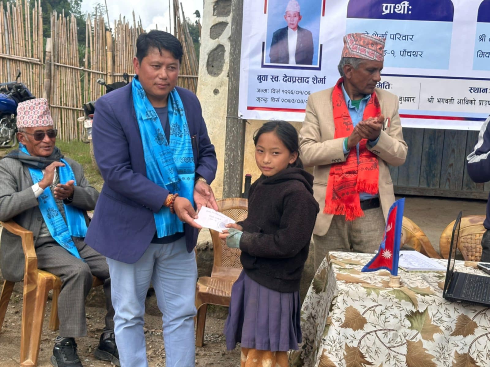 विद्यालयका पूर्वविद्यार्थी एवम् दाता परिवारका सदस्य बच्चु हिमांशु (कैलाश शेर्मा)को विशेष पहलमा आयोजना गरिएको कार्यक्रममा उनले शुभकामना दिंदै यस शैक्षिक संस्थालाई सबैले माया गर्नुपर्ने बताए । उत्तरे शेर्मा परिवारको तर्फबाट जेहेन्दार दुईजना छात्रछात्रालाई पुरस्कृत गरिएको र आगामी शैक्षिकसत्रबाट निरन्तरता दिइने जनाए । वडामा बुद्धिचाल, चित्रकला र भलिबल प्रशिक्षण छिट्टै आयोजना गरिने र श्री फाक्तेप युथ क्लब मार्फत फुटबल प्रशिक्षण समेत आयोजना हुने बताए । उनको व्यक्तिगत लगानीमा प्रवेशद्वारमा आकर्षक विद्यालयको बोर्ड र विद्यालयको प्रत्येक कक्षाकोठामा डस्टबिन सौजन्य गर्ने प्रतिबद्धता समेत जनाउँदै शैक्षिक सुधारमा सहायता पुग्ने विभिन्न आकर्षक कार्यक्रम ल्याउने जानकारी दिए ।