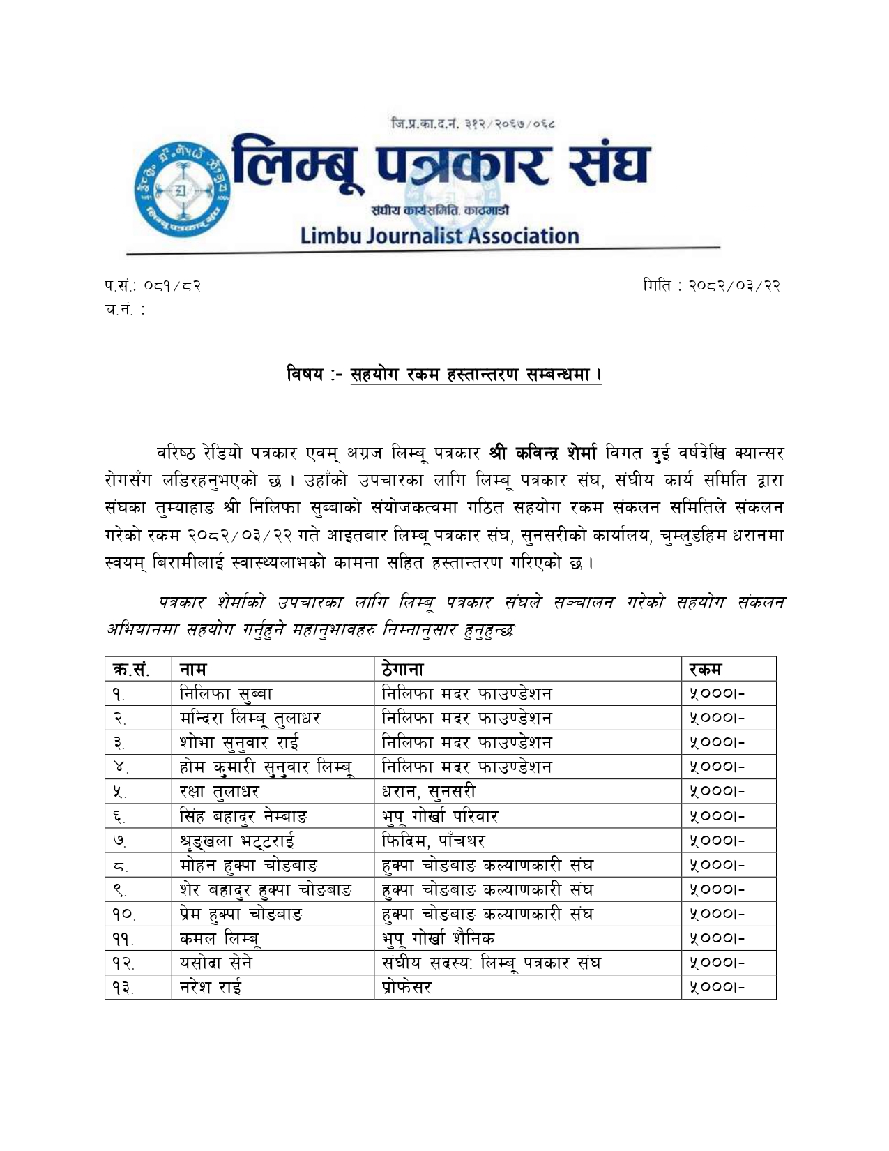 आइतबार लिम्बू पत्रकार संघ, सुनसरीको कार्यालय चुम्लुङहिम धरानमा पत्रकार शेर्मालाई उक्त सहयोग रकम प्रदान गरिएको लिम्बू पत्रकार संघका संघीय अध्यक्ष सन्देश सुब्बाले बताए। संघका तुम्याहाङ निलिफा सुब्बाको संयोजकत्वमा गठित ‘पत्रकार कविन्द्र शेर्मा उपचार सहयोग संकलन समिति’ले जम्मा गरेको रकम पत्रकार शेर्मालाई हस्तान्तरण गरिएको अध्यक्ष सुब्बाको भनाई छ।