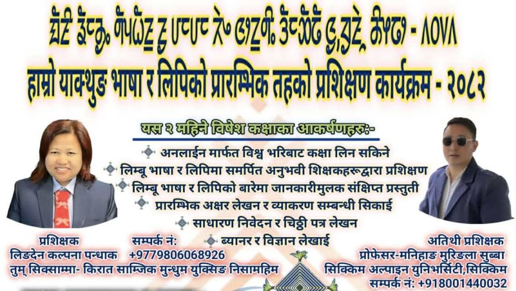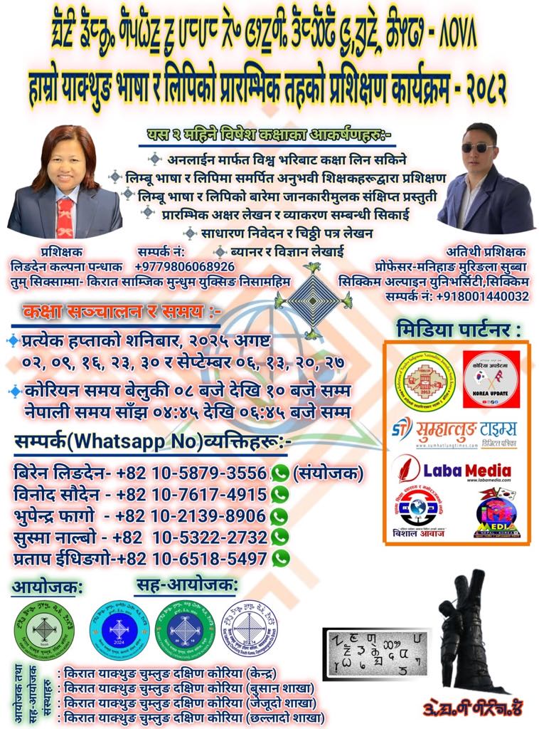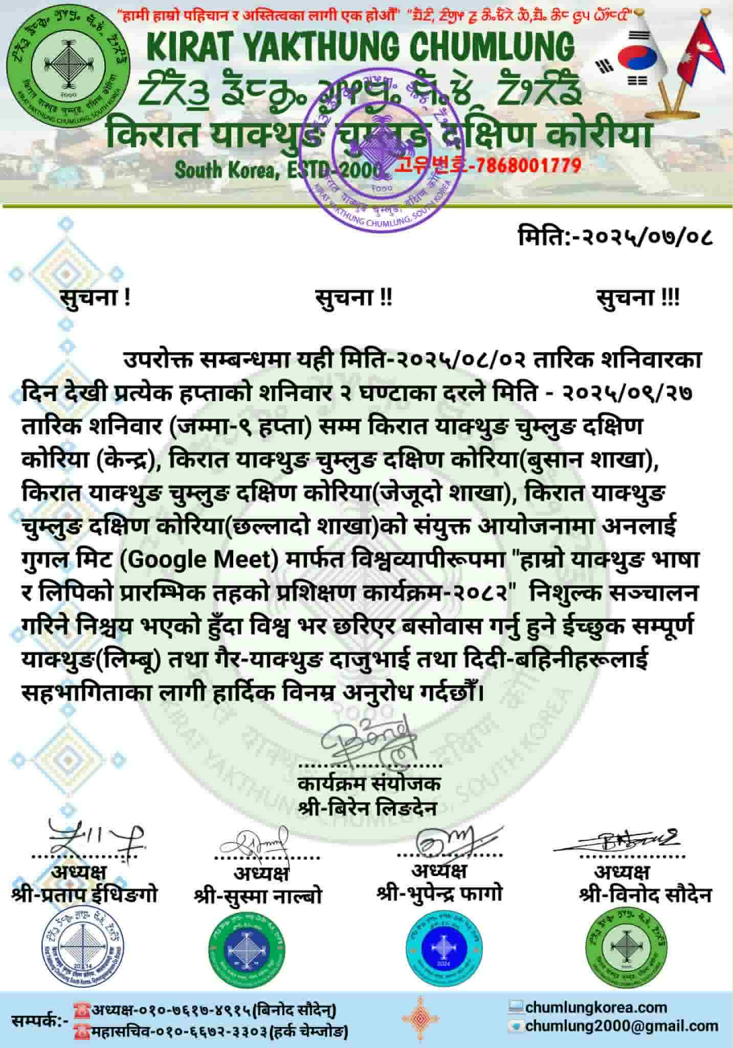 किरात याक्थुङ चुम्लुङ दक्षिण कोरिया (केन्द्र), बुशान, जेजूदो र छल्लादो शाखाहरुको संयुक्त आयोजनामा अनलाईन गूगल मिट (Google Meet) मार्फत विश्वव्यापीरूपमा “हाम्रो याक्थुङ भाषा र लिपिको प्रारम्भिक तहको प्रशिक्षण कार्यक्रम-२०८२” निशुल्क सञ्चालन गर्ने निश्चित भएको अध्यक्ष बिनोद सौदेनले बताउनु भयो ।