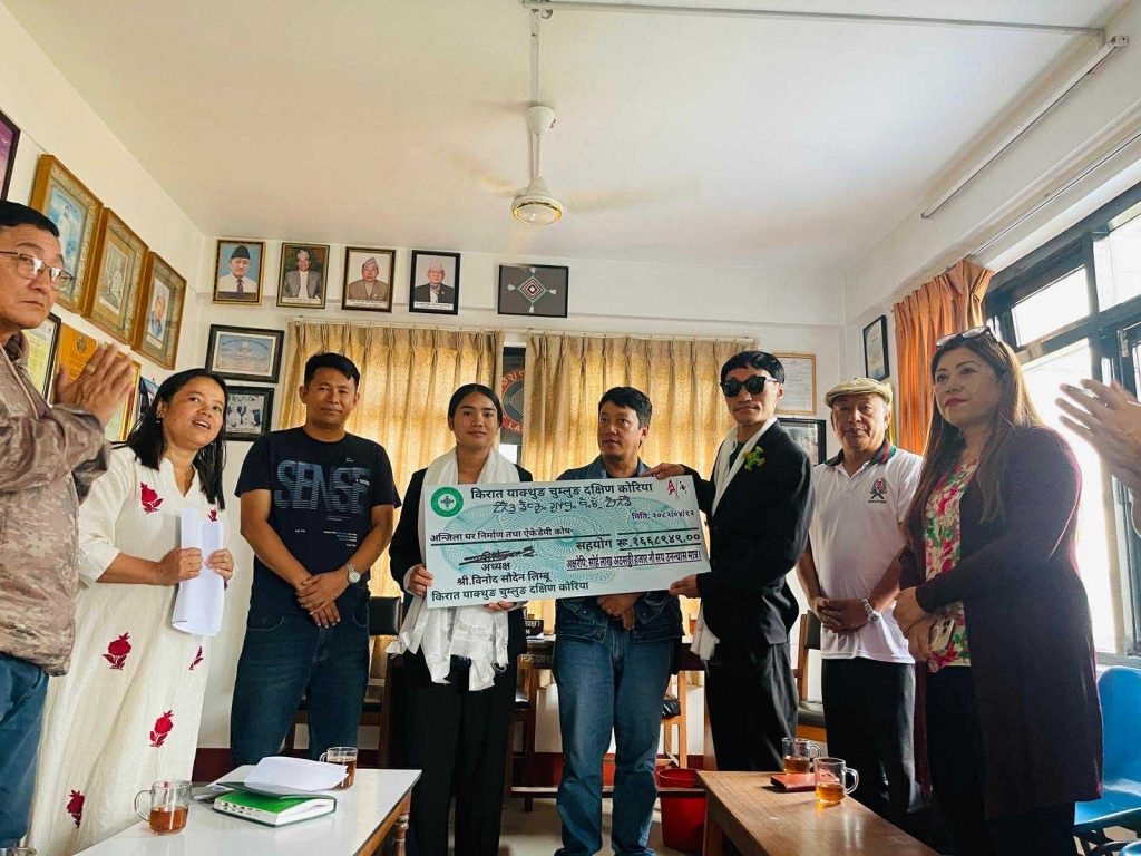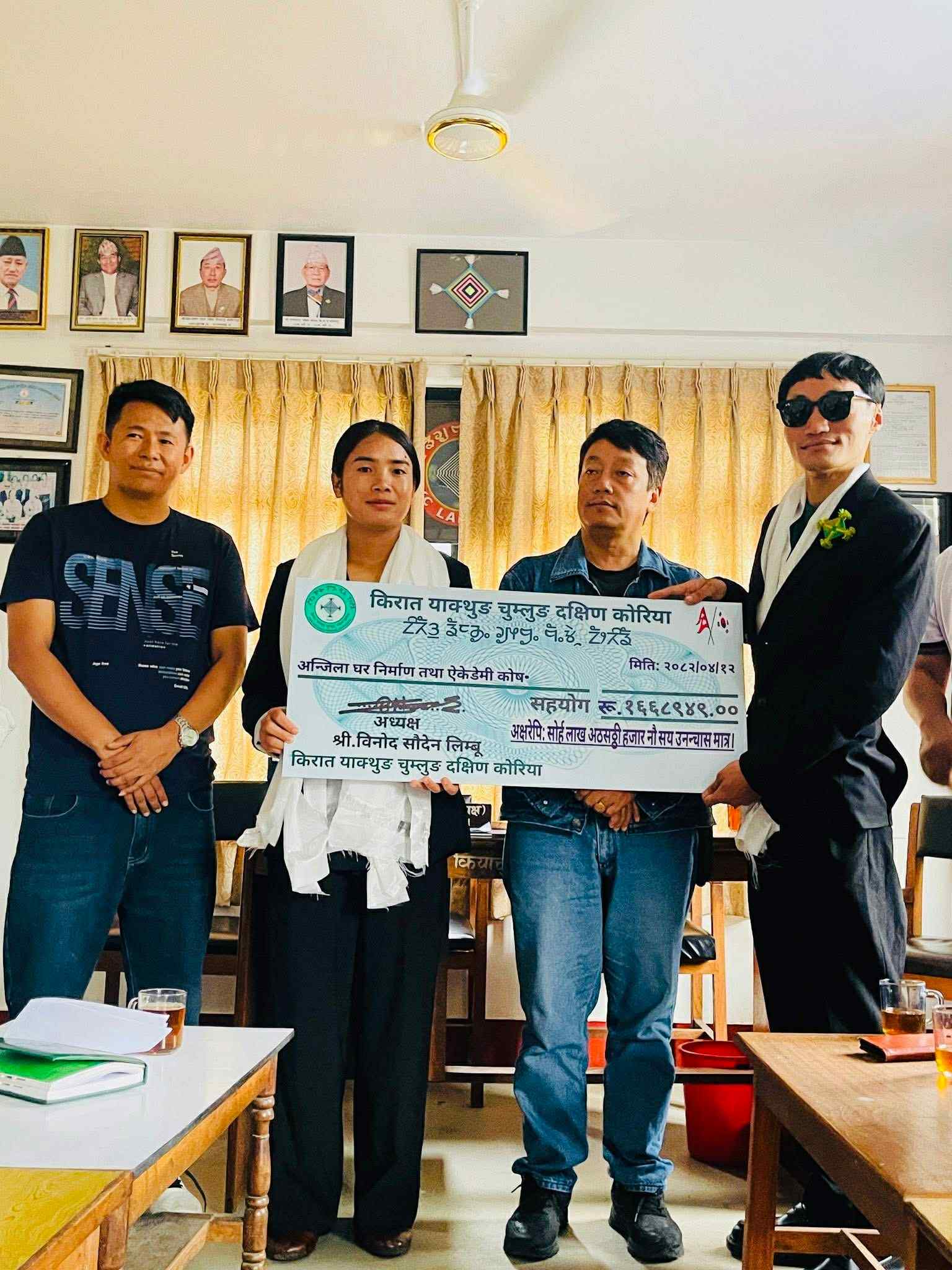 किरात याक्थुङ चुम्लुङ नेपालको सङ्घीय कार्यालय ललितपुरमा, संघीय अध्यक्ष श्री प्रेम एक्तेन, महासचिव श्री निरन्ती तुम्वापो सचिवालय समितिको साथमा चुम्लुङ कोरियाको कोषाध्यक्ष श्री विरेन खेवा लिम्बू लगायत अन्य चुम्लुङका बृहत उपस्थितिमा अन्जिला तुम्बापो सुब्बाको प्रत्यक्ष उपस्थितिमा एकमुष्ठ रू. १६६८९४९.०० (सोह्र लाख अठ्सठ्ठी हजार नौ सय उनन्चास रूपैयाँ) को चेक हस्तान्तरण गरिएको औपचारिक जानकारी अध्यक्ष बिनोद सौदेनले दिएको छ ।