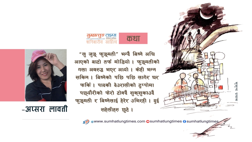 “लु जुङ् फुङ्मती” भन्दै बिष्ने अघि आएको बाटो तर्फ मोडियो । फुङ्मतीको गला अवरुद्ध भएर आयो । केही भन्न सकिन । बिष्नेको पछि पछि लागेर घर फर्कि ।
