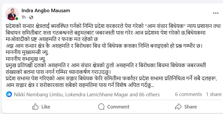 उक्त विधेयक सत्ता गठबन्धनले न्याय प्रशासन तथा विधायन समितिबाट बहुमतको आधारमा पारित गरेको भन्दै नेकपा (माओवादी केन्द्र) प्रदेश संसदीय दलनक नेता इन्द्र बहादुर आङ्बो ‘मौसम’ले गम्भीर आपत्ति जनाएका छन्। विधेयकमा माओवादी केन्द्रको स्पष्ट असहमति र फरक मत रहेको आङबोले बताएका छन्।