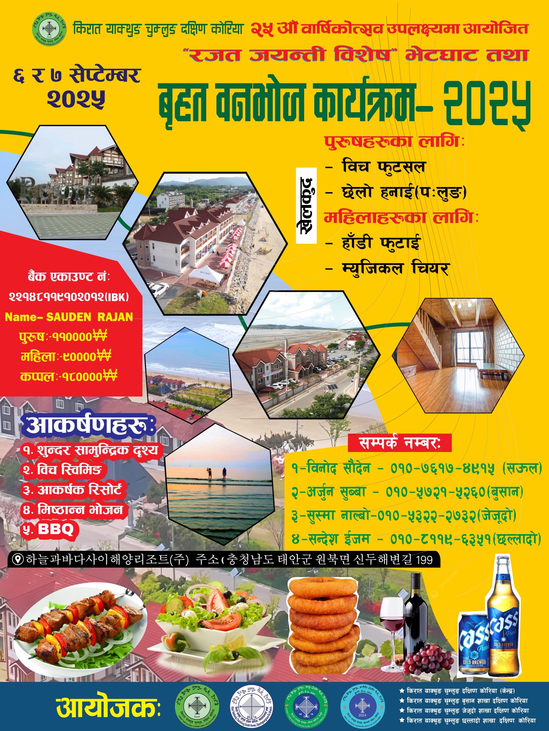 किरात याक्थुङ चुम्लुङ दक्षिण कोरियाले आफ्नो २५ औँ वार्षिकोत्सवको अवसरमा “रजत जयन्ती विशेष भेटघाट तथा बृहत वनभोज कार्यक्रम–२०२५” आयोजना गर्ने भएको छ ।