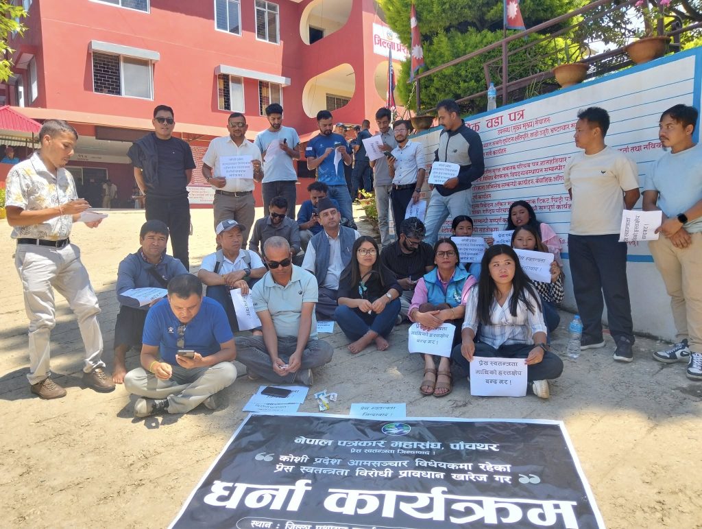 प्रदेशसभामा दर्ता भई अघि बढाइएको विधेयकबाट प्रेस स्वतन्त्रता बिरोधी प्रावधान खारेज गरिनुपर्ने माग सहित पत्रकारहरुले धर्ना दिएका हुन्। प्रदेश समितिले जारी गरेको आन्दोलनका कार्यक्रम अन्तर्गत बिहीबार बिहान जिल्ला प्रशासन कार्यालय अघि धर्ना दिइएको नेपाल पत्रकार महासंघ, पाँचथरका अध्यक्ष भिम कुमार बाँस्कोटाले बताए।
