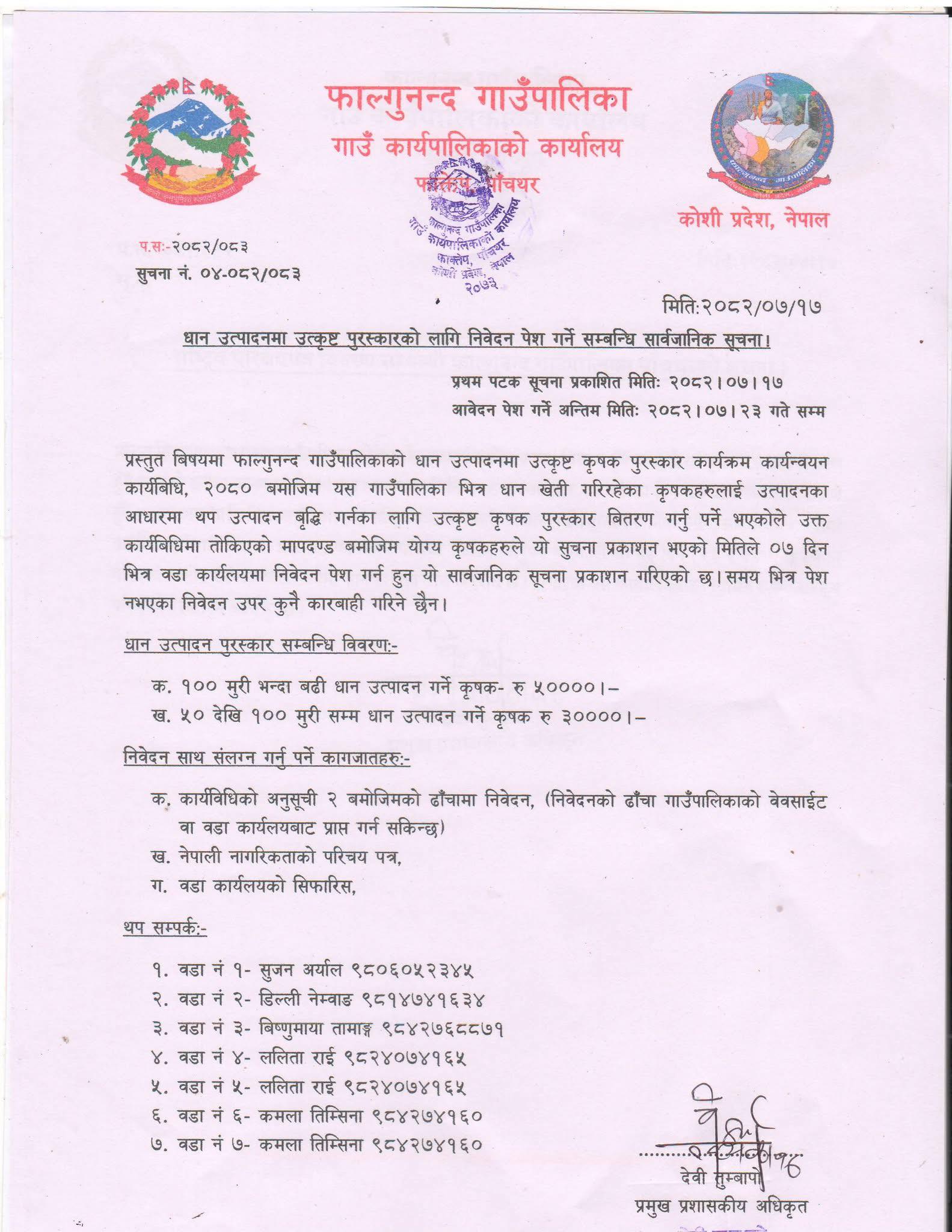 गाउँपालिकाले सोमबार सूचना जारी गर्दै सूचना प्रकाशित भएको सात दिनभित्र सम्बन्धीत वडा कार्यालयमा निवेदन पेश गर्न पालिकाभित्रका धान उत्पादक कृषकहरुलाई आह्वान गरेको छ। फाल्गुनन्द गाउँपालिकाको धान उत्पादनमा उत्कृष्ट कृषक पुरस्कार कार्यक्रम कार्यविधि २०८० अनुसार कृषकहरुलाई उत्पादनको आधारमा प्रोत्साहनका लागि पुरस्कृत गर्दै आएको गाउँपालिकाका प्रमुख प्रशासकीय अधिकृत देवी तुम्बापोले बताए।