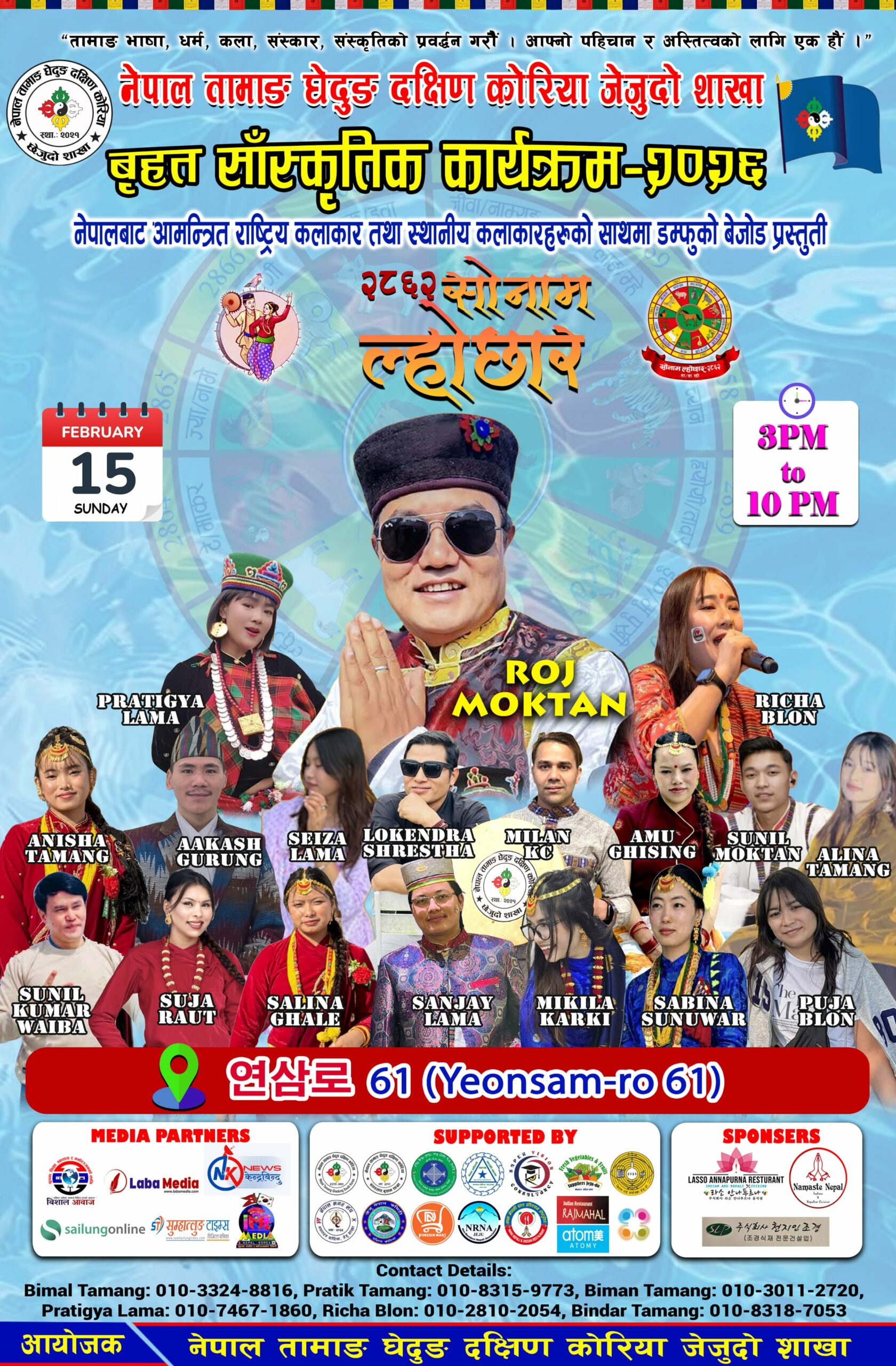 कोरियाली पर्व सल्लनालको पावन अवसर पारेर १५ फ्रेबुअरी २०२६ मा जेजुदो को 연삼로 61 (lions club building) मा सोनाम ल्होछार बृहत् सोनम ल्होछार साँस्कृतिक कार्यक्रमको तयारी तिब्र पारिएको हो । यूरोप, अमेरिका लगायत बिभिन्न देशमा स्टेज शो गरी सक्नु भएको चर्चित गीत कलकते काइयो, हेलबुको बजारमा, हिउ पर्यो फुरुरु लगायत दर्जनौ सेलो तथा नेपाली हिट गीत गाइसक्नु भएका राष्ट्रिय गायक रोज मोक्तानको विशेष प्रस्तुति रहने छ ।