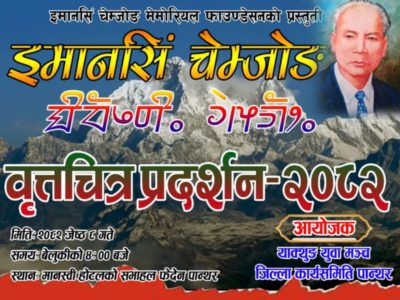 ८ जेठ २०८२ पाँचथर। सदरमुकाम फिदिममा बिहीबार इतिहासकार इमानसिं चेम्जोङको जीवनीमा आधारित वृत्तचित्र ‘इमानसिं चेम्जोङ’ प्रदर्शन गरिएको छ। याक्थुङ युवा मञ्च, पाँचथरको आयोजनामा फिदिमस्थित मनश्वी होटलको सभाहलमा वृत्तचित्र प्रदर्शन गरिएको हो। इतिहासकार इमानसिं चेम्जोङको जीवन भोगाई र इतिहास लेखनको क्षेत्रमा…