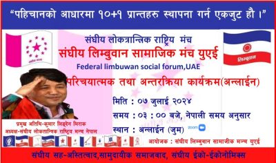 २१ असार २०८१, युएई। संघीय लिम्बुवान सामाजिक मञ्च युईले पहिचानको आन्दोलन र लिम्बुवान सहितको दश प्लस एक प्रान्त स्थापनाको औचित्यबारे भर्चुअल माध्यमबाट अन्तरक्रिया गर्ने भएको छ। जुलाई ७ तारिखका दिन नेपाली समय अनुसार अपरान्ह तीन बजेदेखि कार्यक्रम सुरु हुने संघीय…